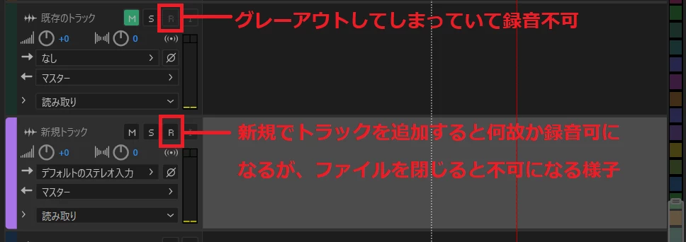 とはいえ、それもファイルを閉じてからまた開くと既存トラック扱いになるのか、また録音不可の状態になってしまうようでしたので、このままだと録音する度に延々トラックを追加しなければならなくなってしまいます。