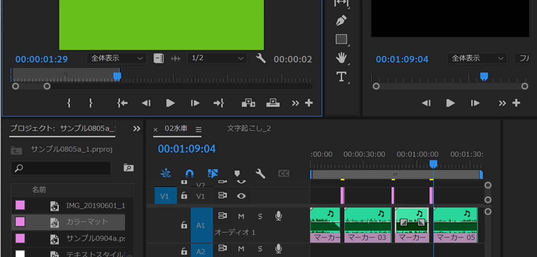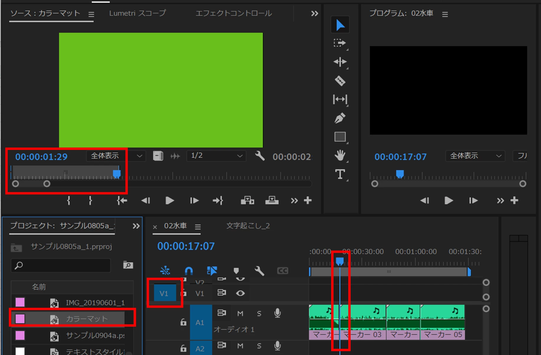 次に任意のファイル(ここではカラーマット)を「ソースモニター」に読み込み、イン点・アウト点を設定して2秒間にカット編集を行います。