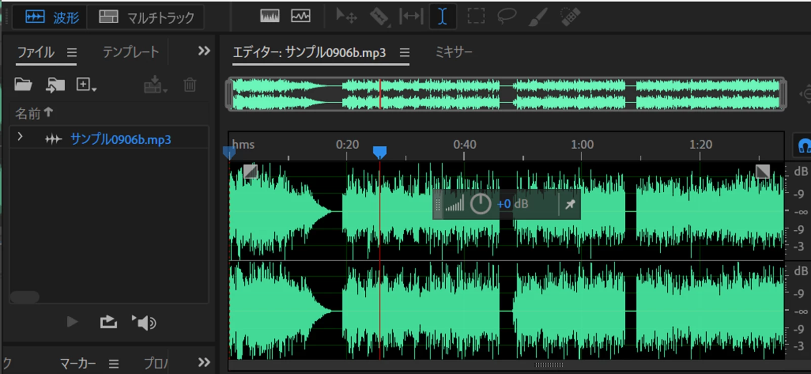 Auditionから音声の区切り単位をファイルとして書き出して、Premiere Proに読み込み、ファイル間に2秒間のギャップを挿入し、.mp3ファイルで書き出します。最後にその.mp3ファイルをAuditionに読み込みます。