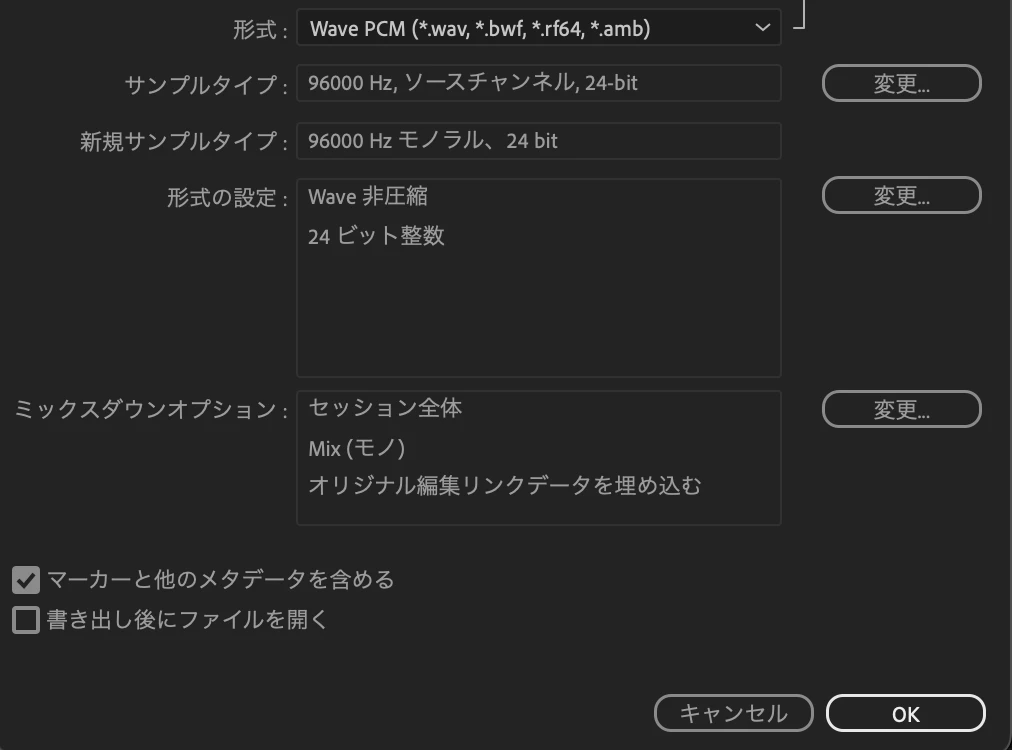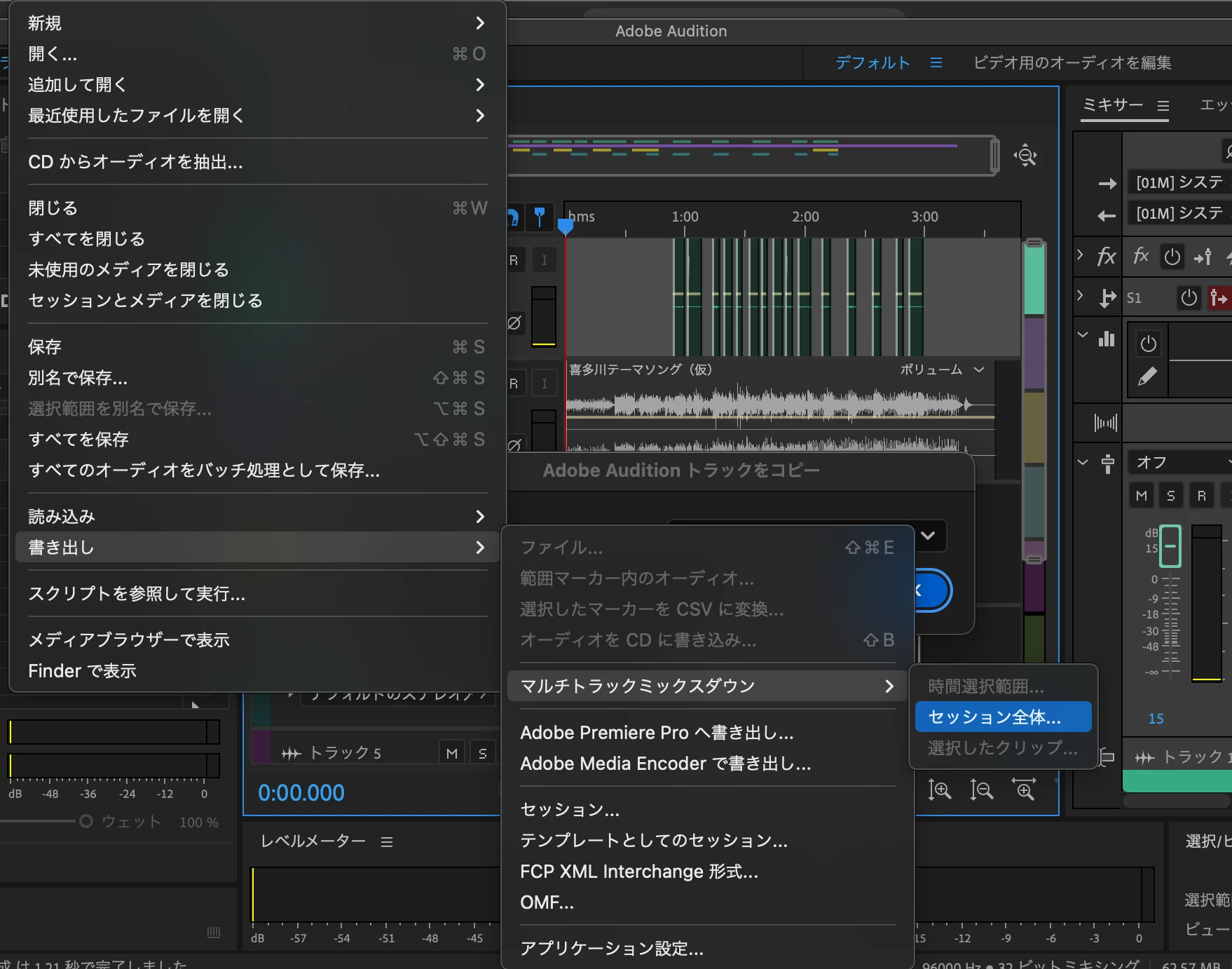 書き出し>マルチトラックミックスダウン>セッション全体を選択し、指定の設定で書き出すと無音のwavになってしまう。