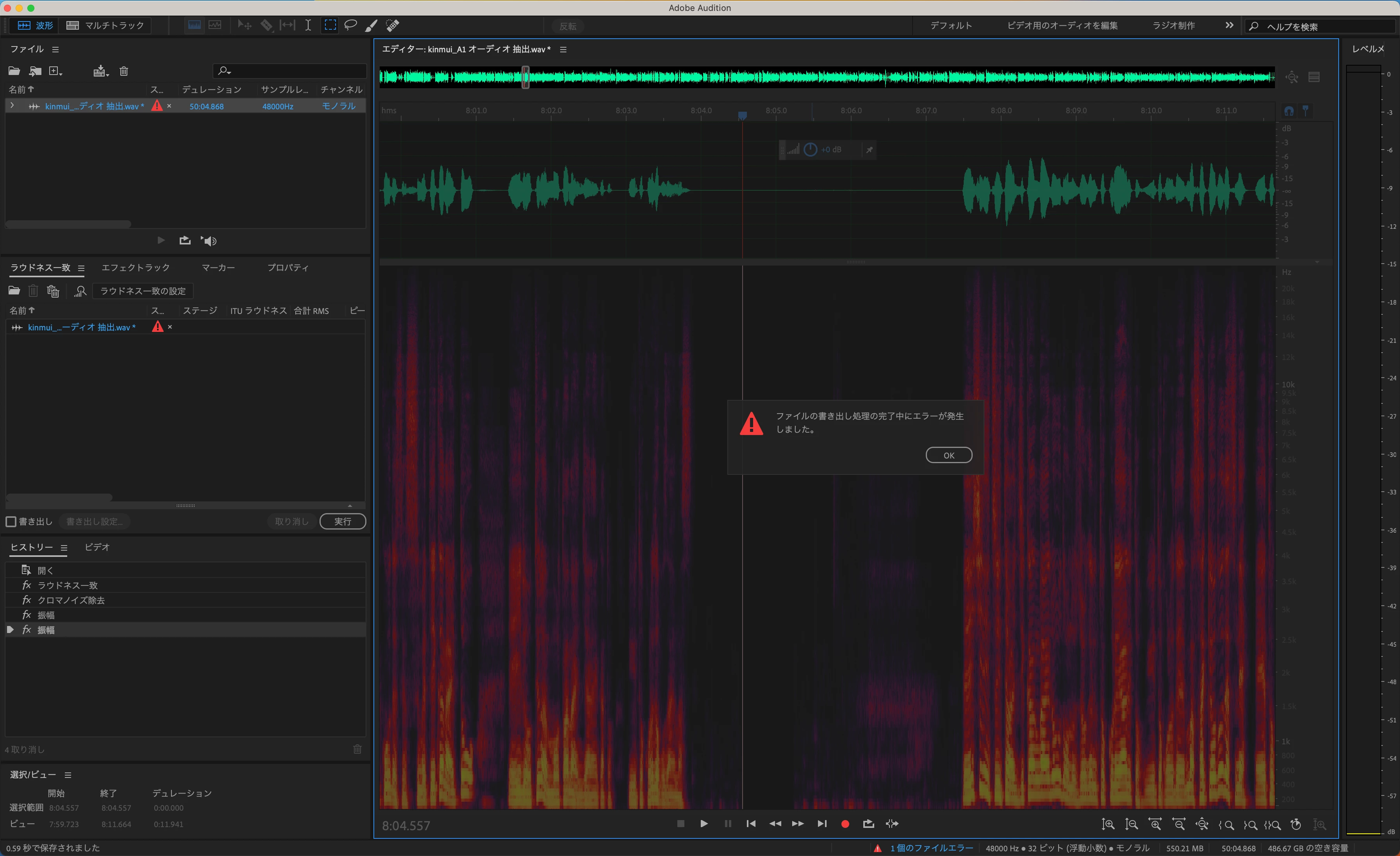Auditionでノイズ除去したのちに保存すると、下記のエラーメッセージが出て、