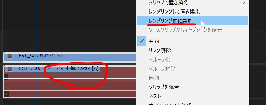 wavファイルが消えてオフラインになってしまったAudition送信済みのクリップを右クリックして、「レンダリング前に戻す」を実行します。