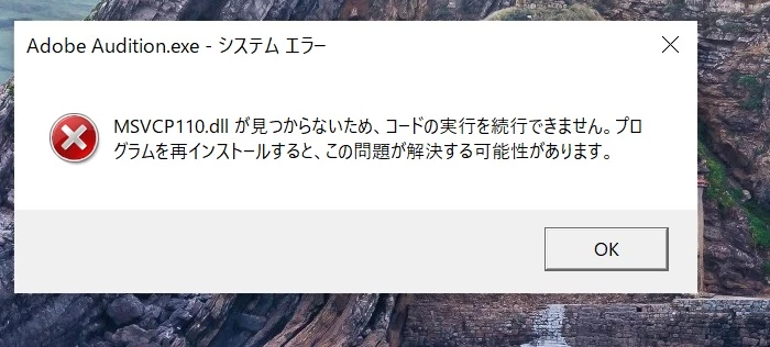 「Adobe Audition.exe」から直接起動しようとしても下記画像の通りエラーメッセージが出てしまい起動できません。