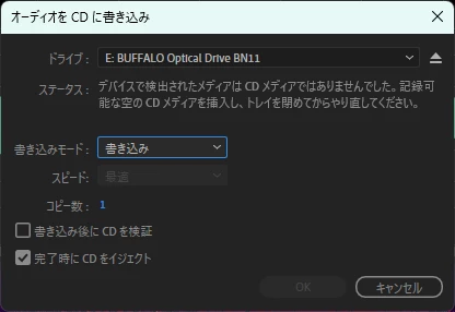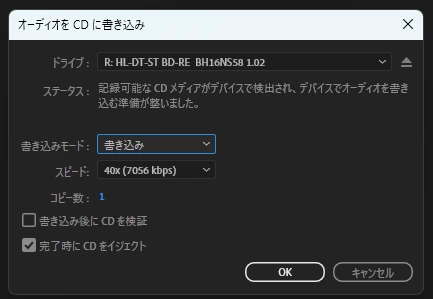 下記のCDへの書き込み画面で [OK]を押すと必ずクラッシュするようです。