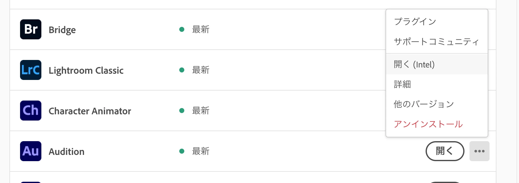 解決策として、Creative Cloudアプリ上で「開く(Intel)」で実行すると、一時的にRosetta2動作になりM1対応でないプラグインも認識できるようになります。