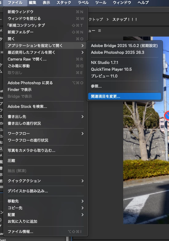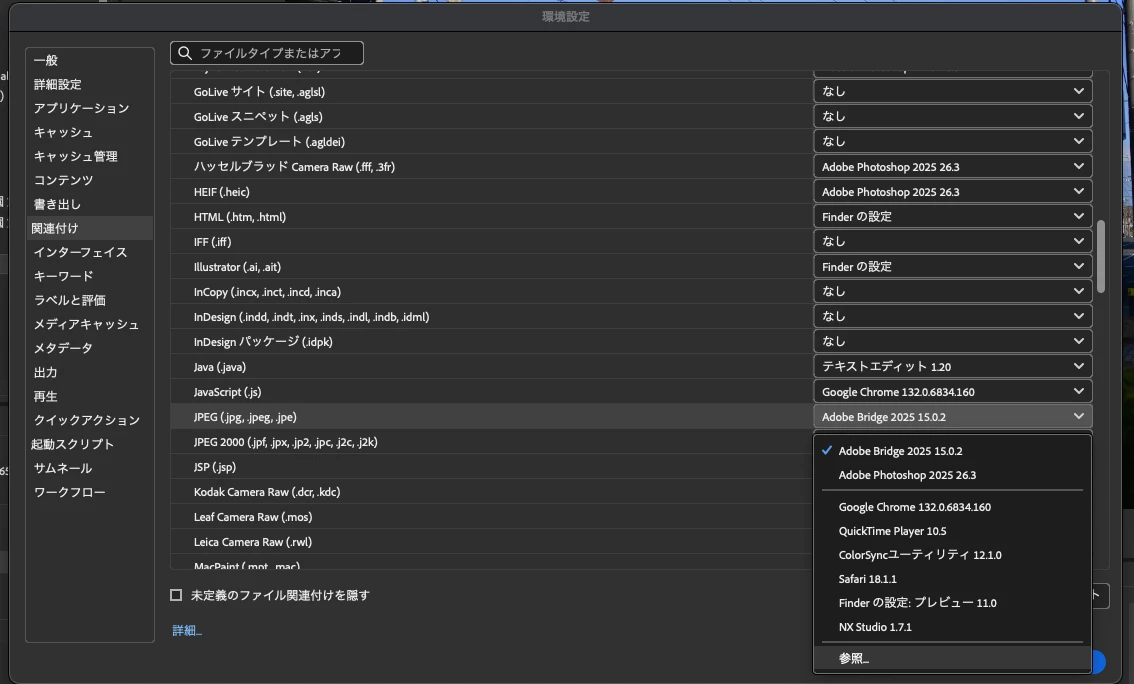 基本取り扱っているのが画像データ(jpgとraw)なので、関連項目を変更から該当の欄をBridgeにして解決しました。