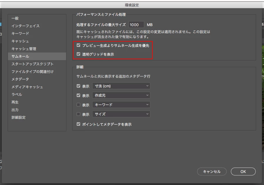 また、Bridgeの動作が重たく感じられるのは、プレビュー生成に時間がかかっているためなので、下記の設定を変更することで、初期の動作の重さを軽くすることができるかもしれません。ただし、フルスクリーンプレビュー時などは逆に時間がかかります