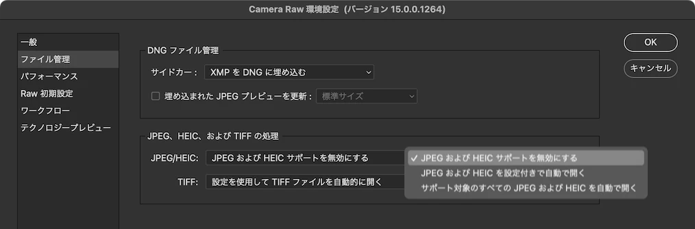 「JPEG および HEIC サポートを無効にする」では Camera Raw で開くことはできませんから、2番目か3番目を選んでください。