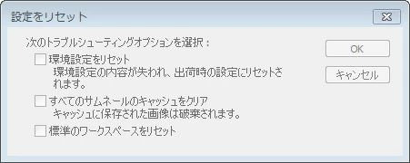 Bridge CCは「Optionキーを押したまま起動する(Mac)」や「Ctrl+Altを押したまま起動する(windows)」という操作で「設定をリセット」するウィンドウを出す事が出来ます。