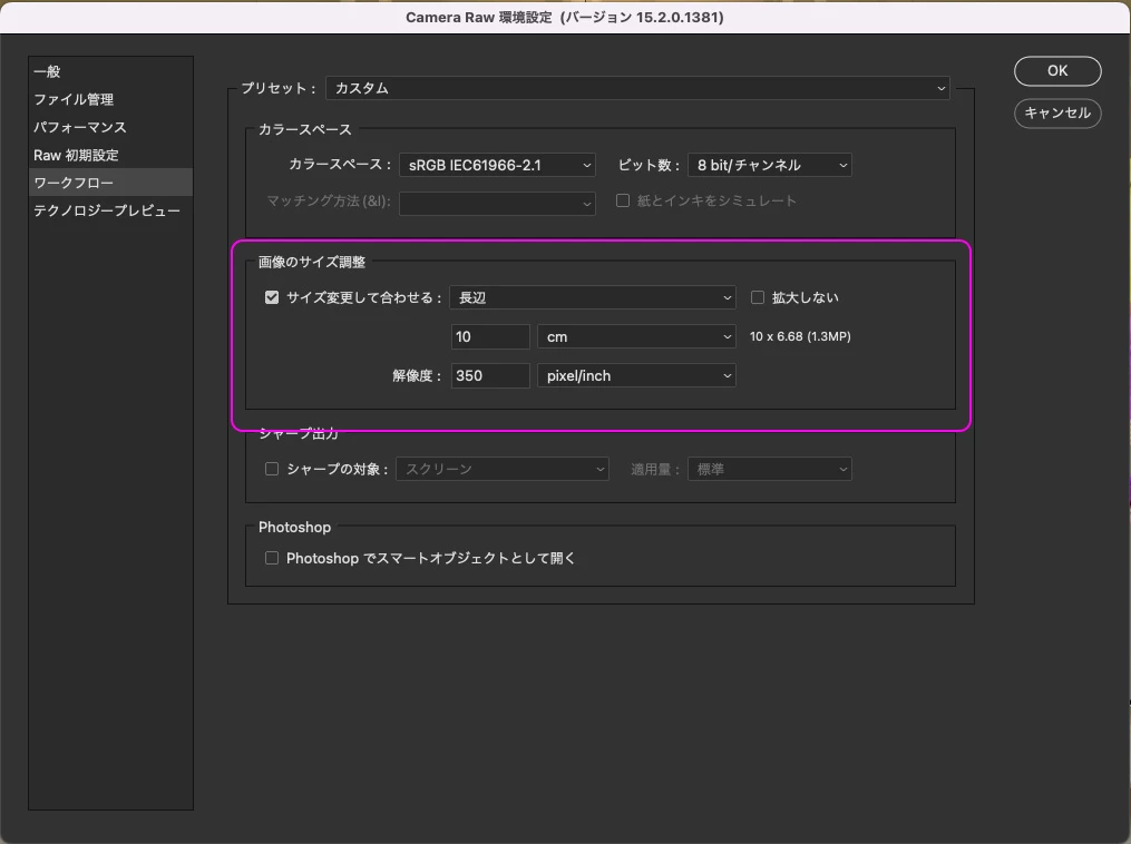 Camera Raw 15.2 環境設定のサイズ調整で変更したサイズで100%表示できない