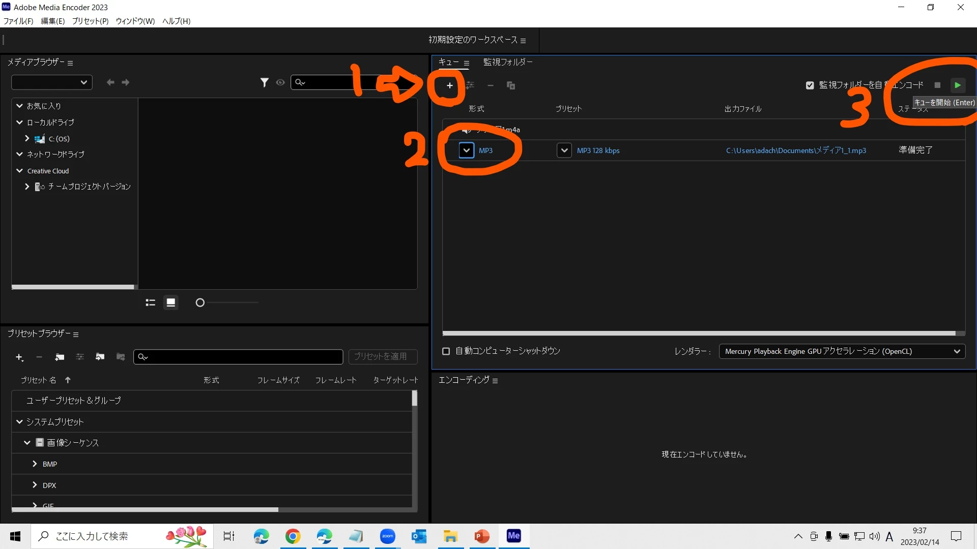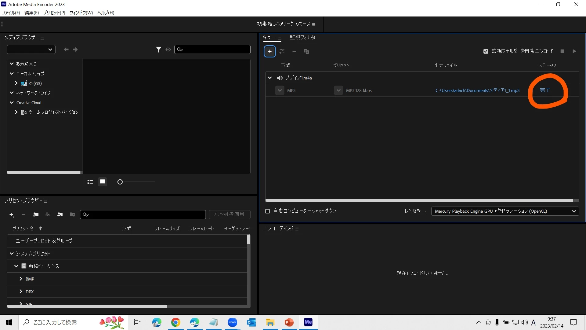 そして、実際に読み込めないファイルの場合は、Captivateと同時に提供されているMedia Encoderを使って、m4aをmp3に変換し、PPTに再度読み込めば理論上は読み込みが可能となるはずです。