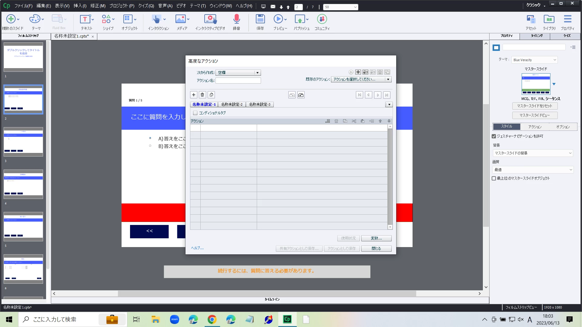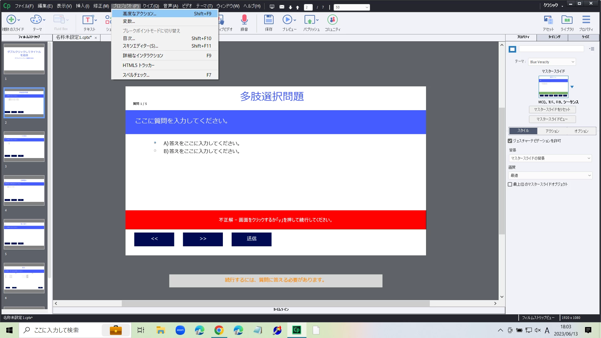 Captivateのメニューバー>プロジェクト>高度なアクション