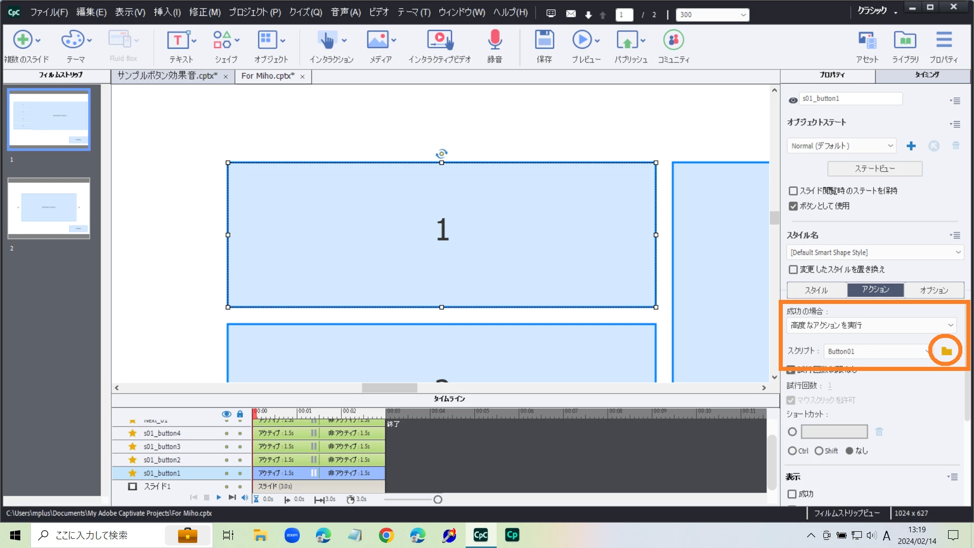 ボタンとして設定しているオブジェクトのアクションで「高度なアクション」を選択します。