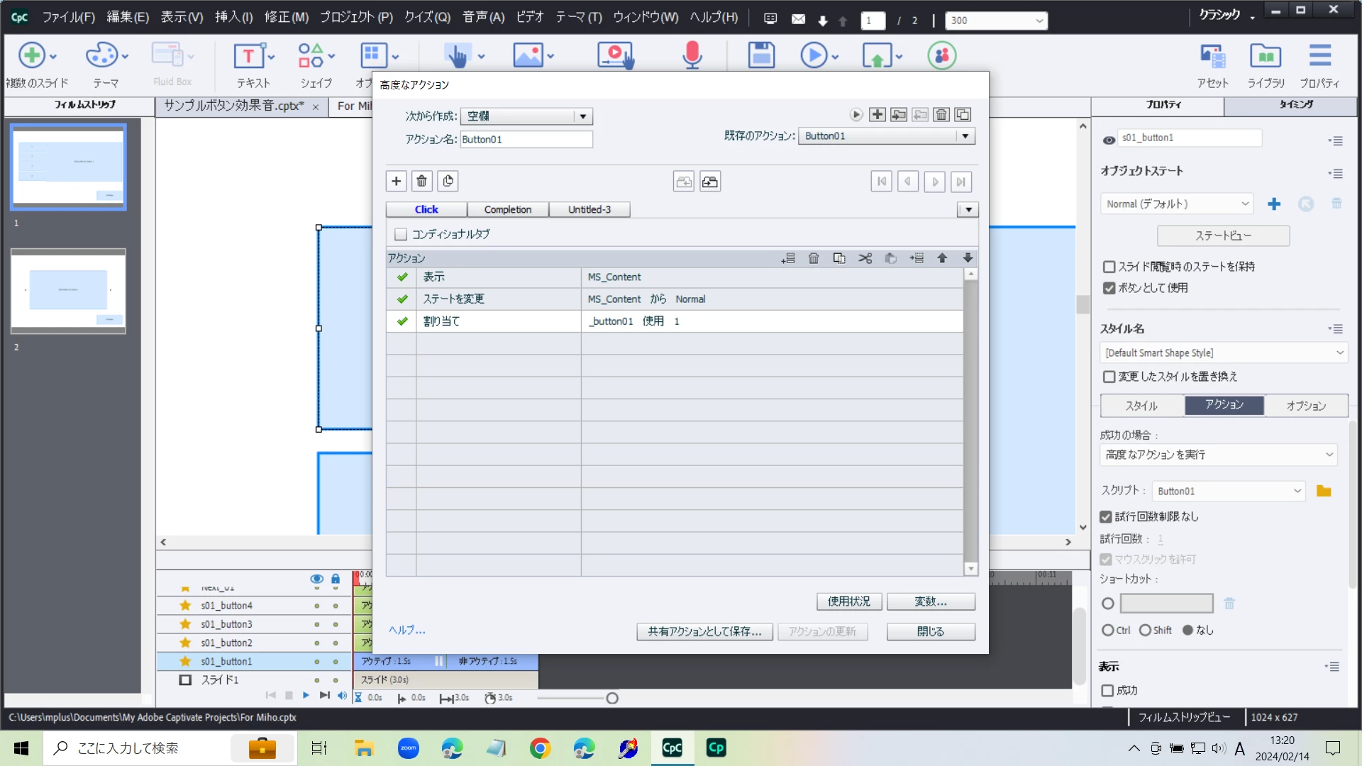 ⑤ 元のスライドに戻り、ボタン大のアクションを シェイプ1のステート1に移動するよう、設定します。