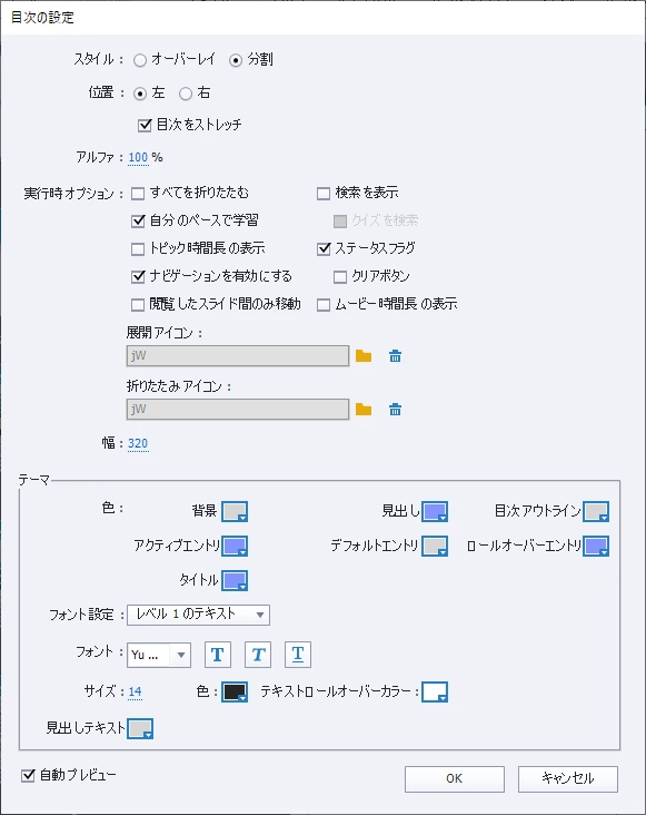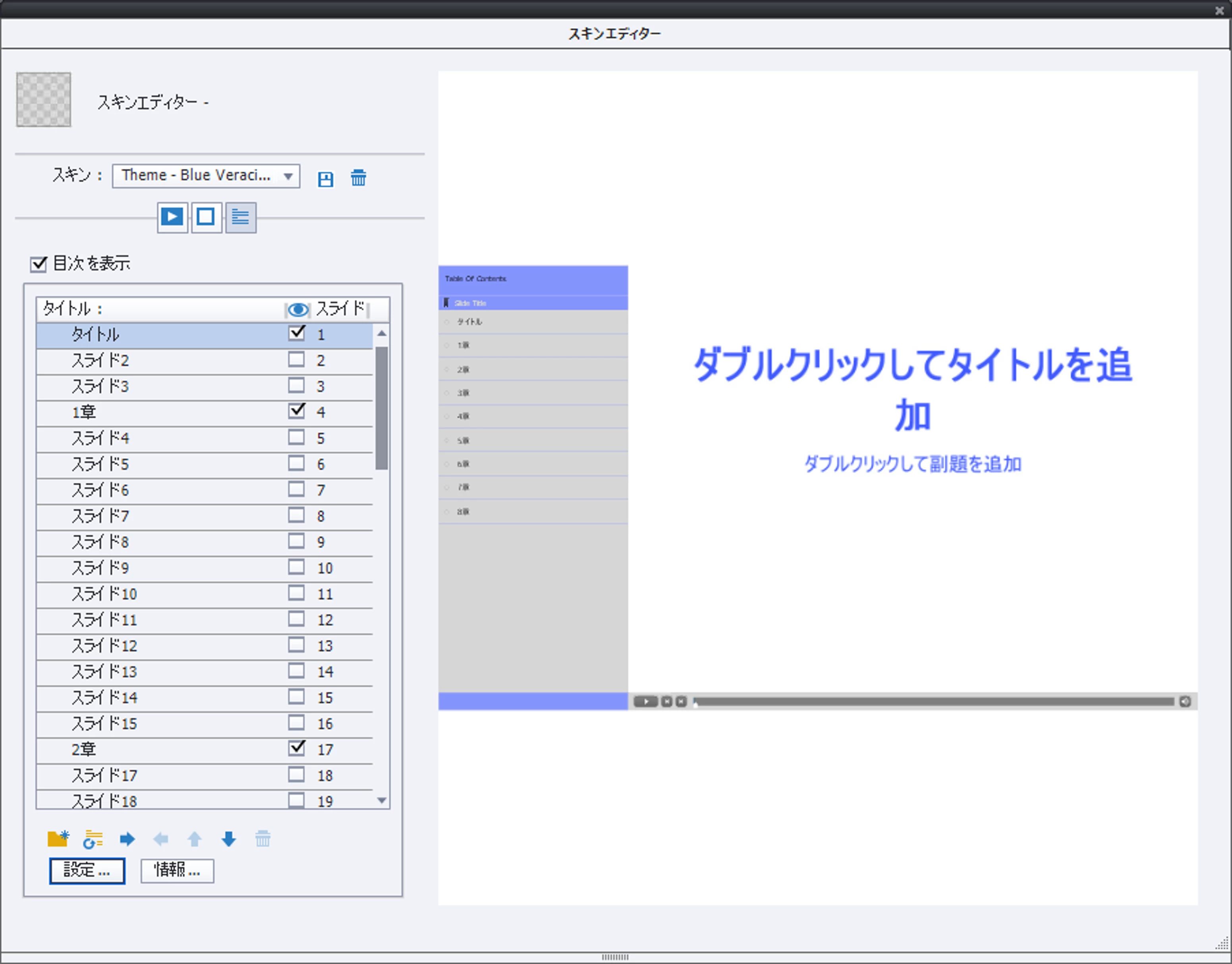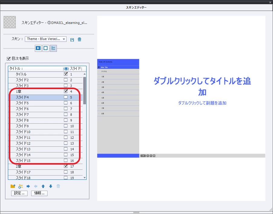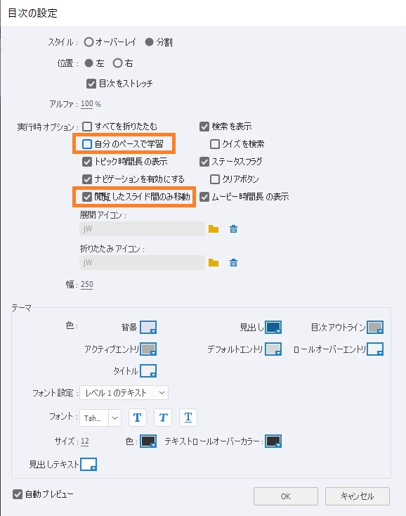 そこで、範囲内のスライドを全て閲覧した時点で、目次のタイトルに✓が付くよう改善したいのですが、どの設定を見直したら良いでしょうか?