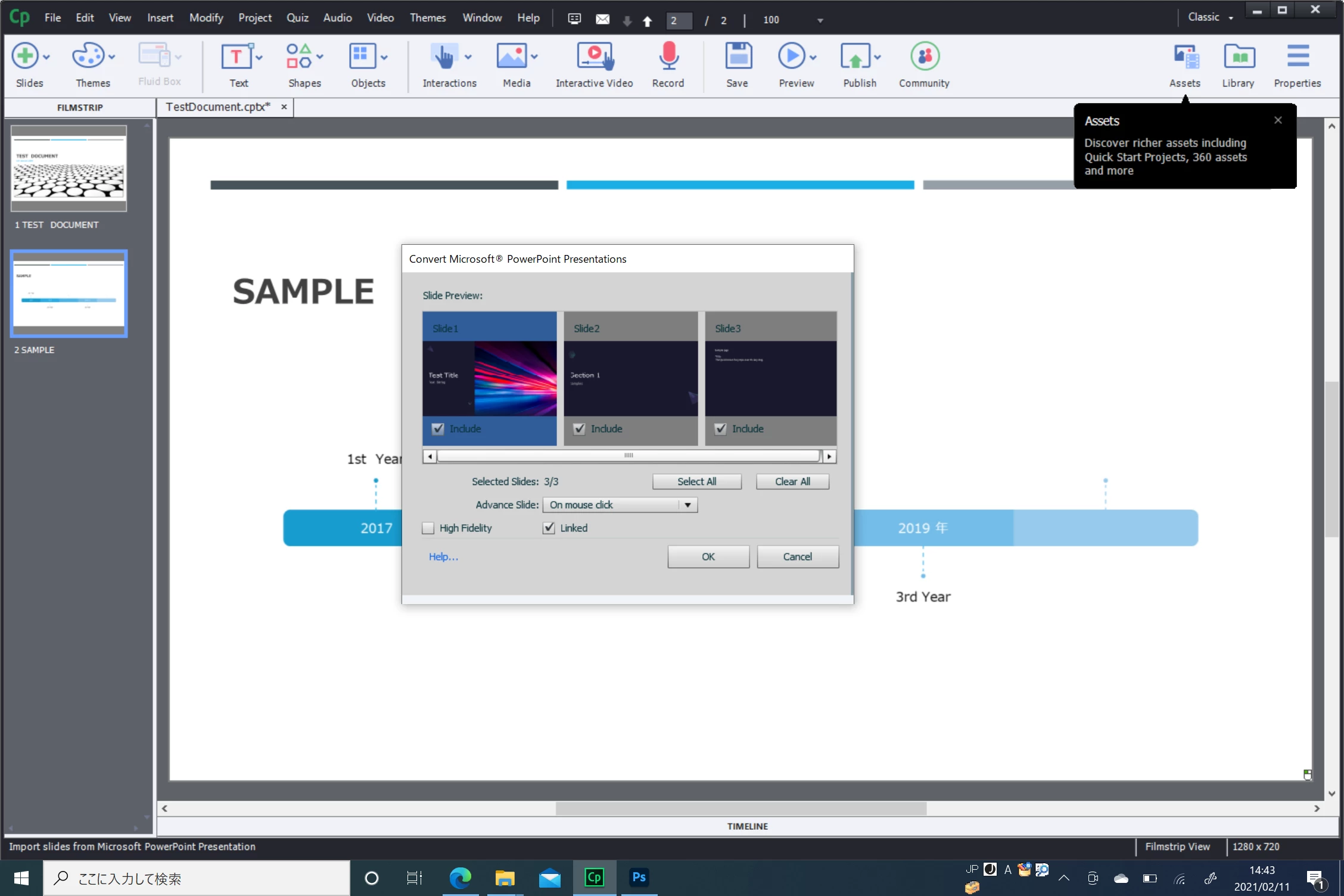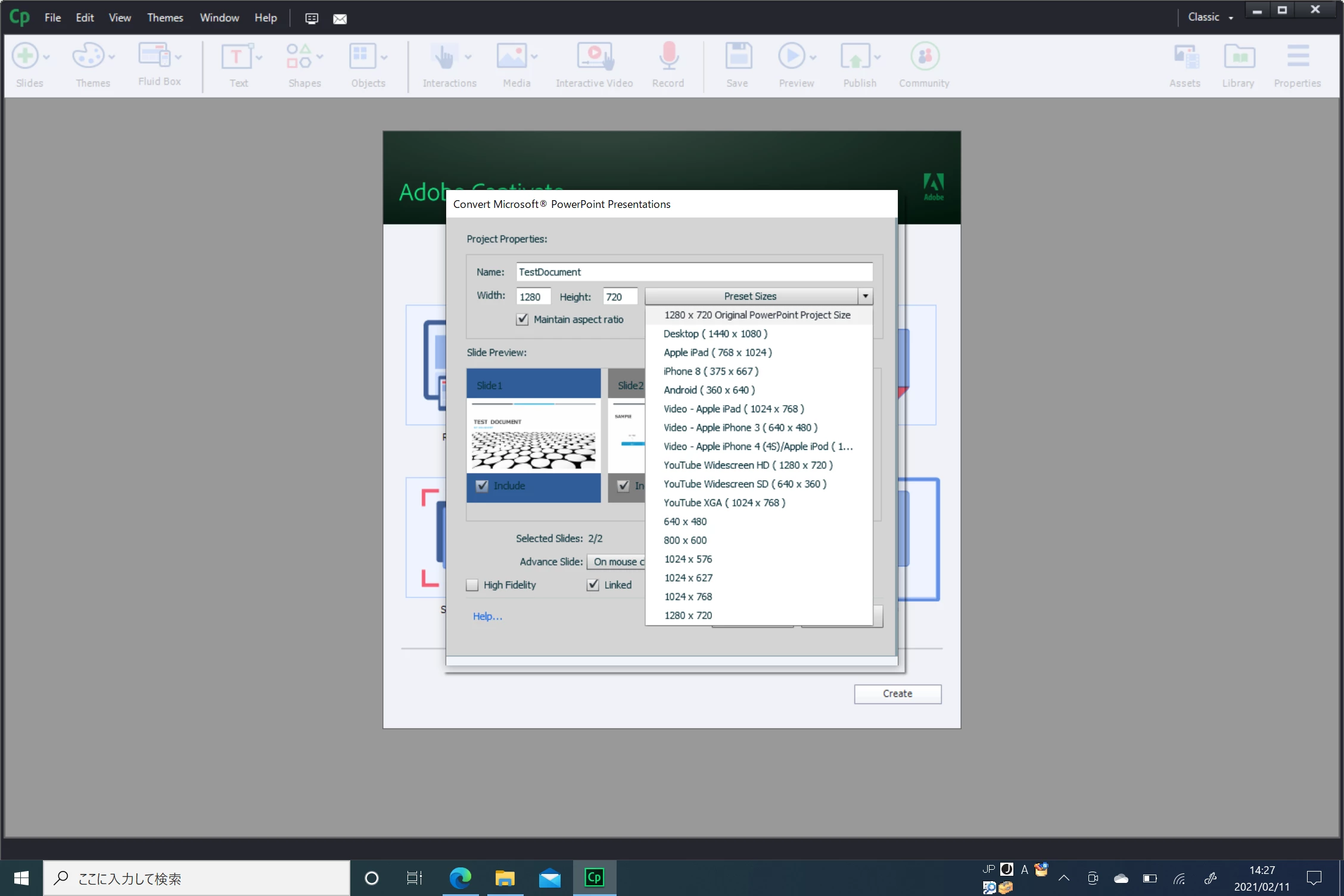 PowerPointで作成したトレーニングを5つほど分岐で入れる予定ですが、PowerPointとCaptivateのサイズが合わず、配置が崩れてしまいます。