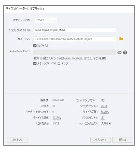 ① パブリッシュ時に開くパネルで「詳細」をクリックし、eラーニング出力をクリックします。