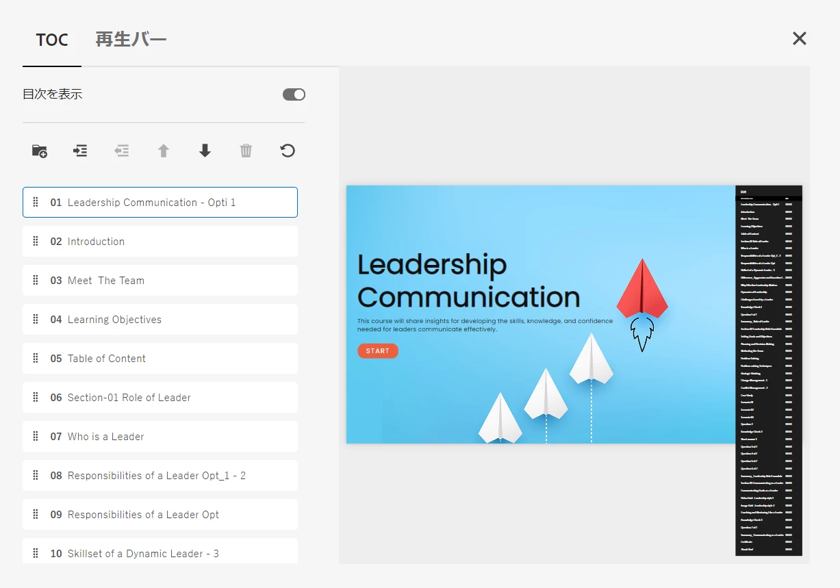 1 画面右下、プロパティバーの「目次および再生バー」をクリックします