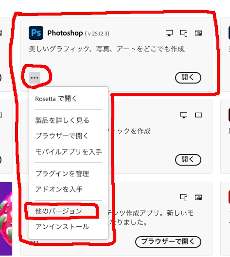 >Photoshop (25.12.3) や Photoshop (24.7.4) などのバージョンの違い