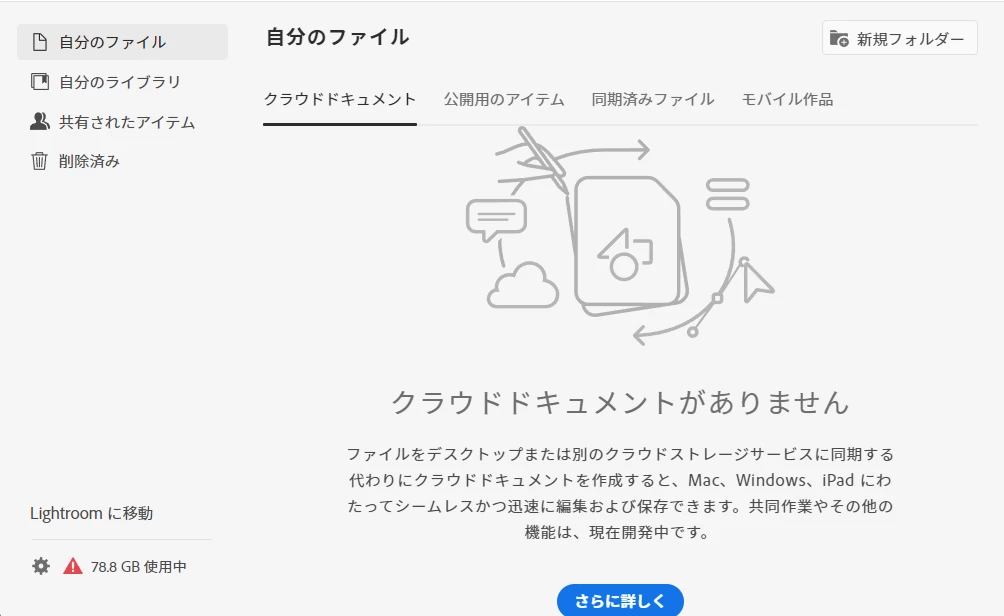 しかし、Adobe Creative Cloud上では、いまだ78GB状態となっています。