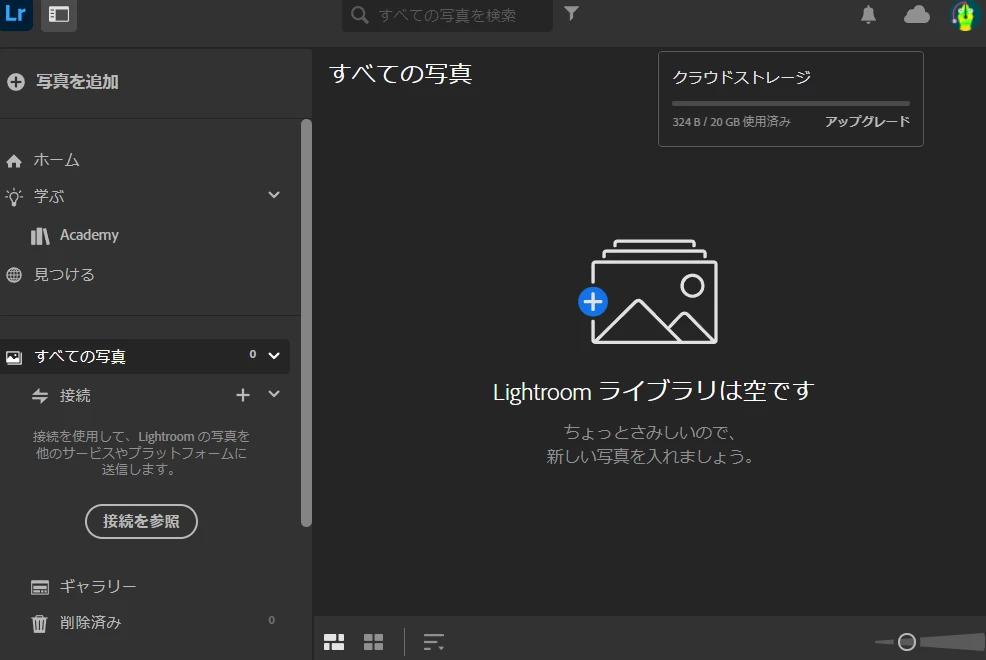 LightroomCCのサイト上では、クラウドが解放され、現在20GBの空きがあります。