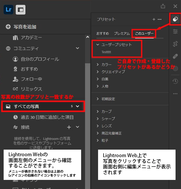 画像やプリセットが同期されているのかを確認する場合、以下Lightroom Web版へアクセスしてご確認ください。