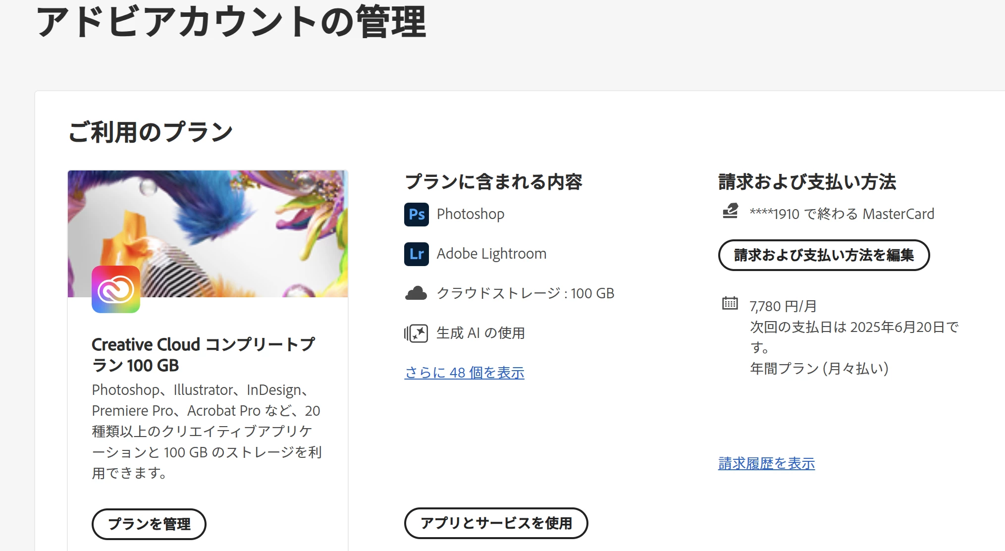 本来使用できるはずのillustratorなどを開こうとすると購入を要求され、試しに購入しようとすると、既に Creative Cloud All Apps 100GB をご購入済みですと表示されてしまいます。
