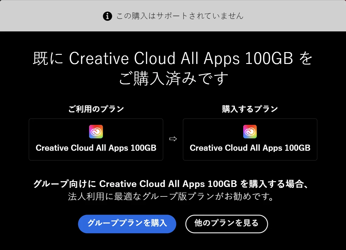 「現在のプランではご利用いただけません。クリックして購入」→「既に Creative Cloud All Apps 100GB をご購入済みです」の繰り返し