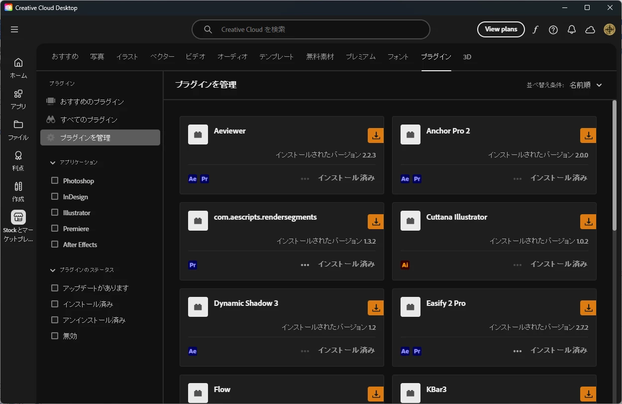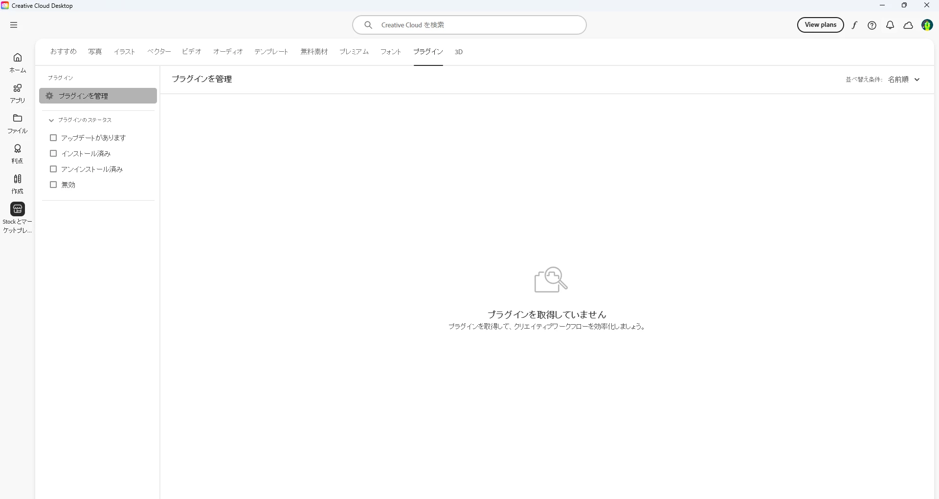 ccアプリにてストックとマーケットプレイスのプラグインの欄から検索やプラグインの取得画面が表示されません。対処法を教えてください。