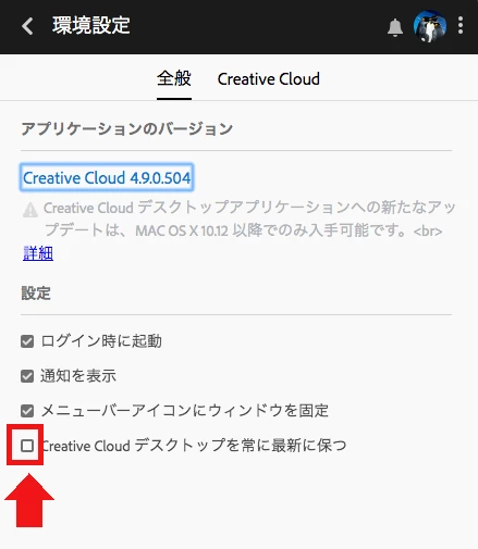 「環境設定」が表示されたら「Creative Cloudデスクトップを常に最新に保つ」からチェックを外します。