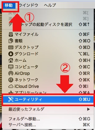 - Finderメニューの〔移動〕から〔ユーティリティ〕をクリックします。
