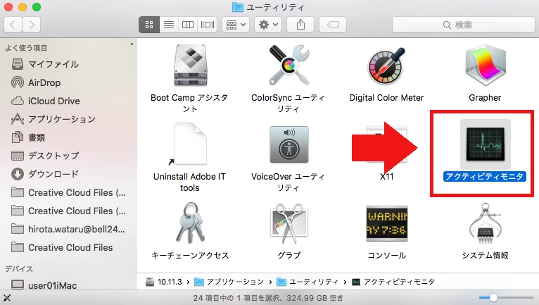 ユーティリティのウィンドウが表示されたら、〔アクティビティモニタ〕をダブルクリックして起動します。