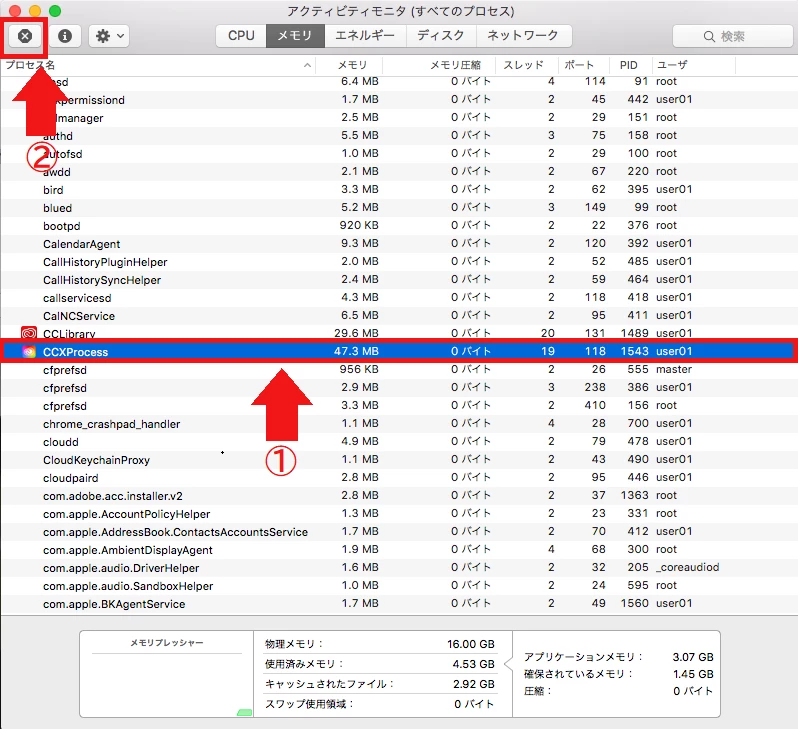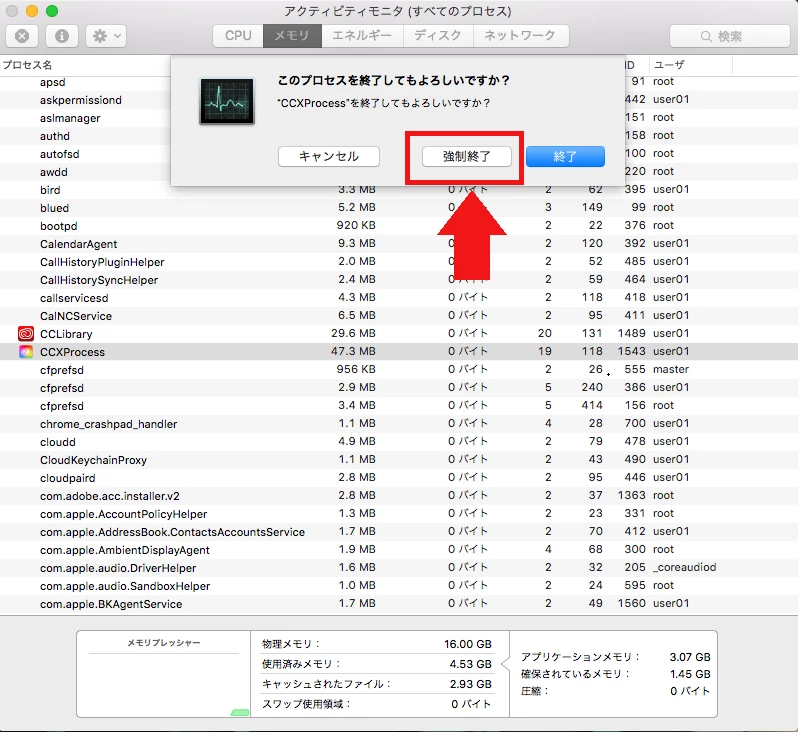 - アクティビティモニタが起動したら、以下のプロセスを強制終了します。