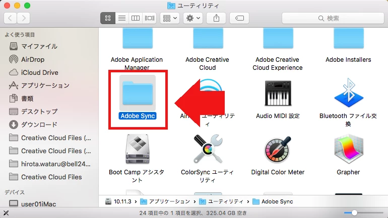 - ユーティリティのウィンドウが表示されたら、〔Adobe Sync〕フォルダをダブルクリックして開きます。