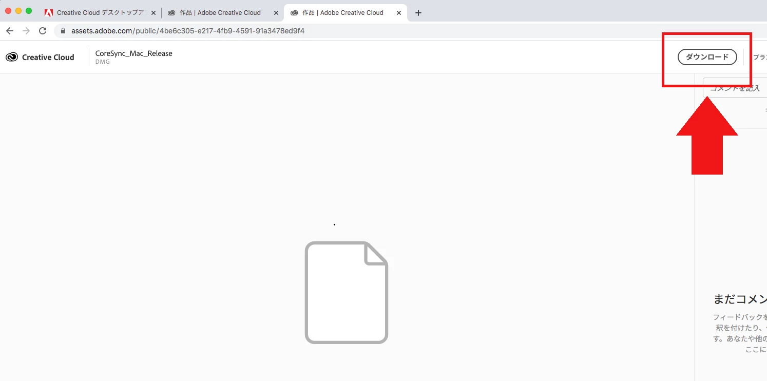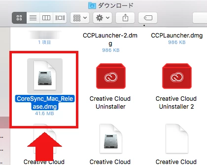 - ダウンロードフォルダを開き、〔CoreSync_mac_Release.dmg〕というファイルを開きます。