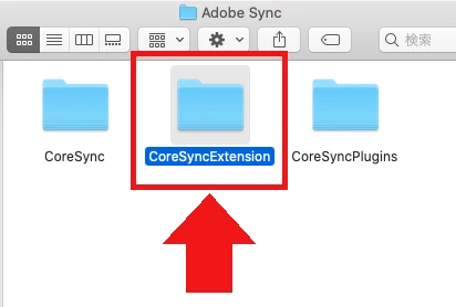 - 一旦〔Adobe Sync〕フォルダに戻り、続いて〔CoreSyncExtension〕フォルダに移動します。