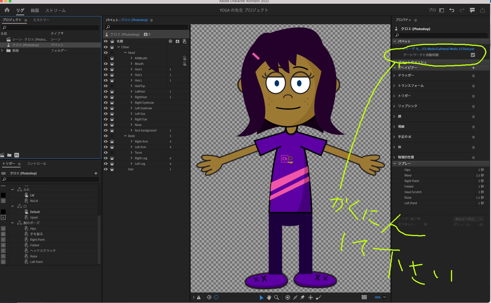 リグモードでパペットを選択すると右ウィンドのところに『アートワークと自動同期』があります。