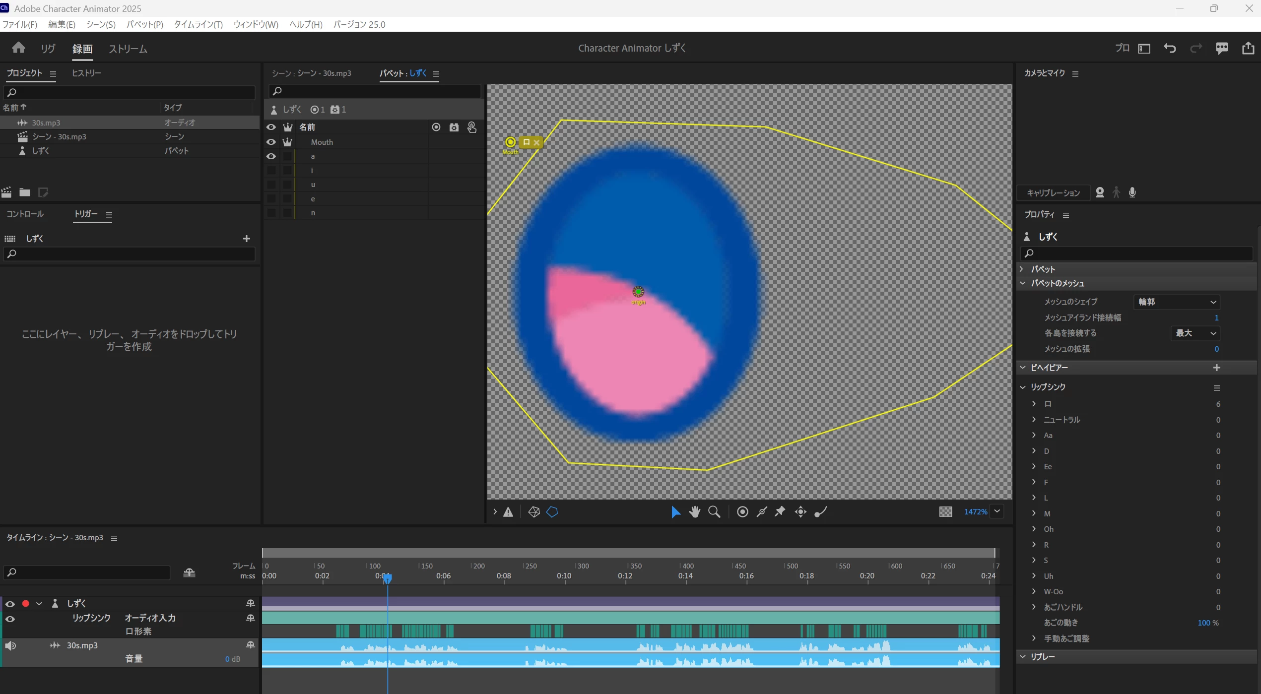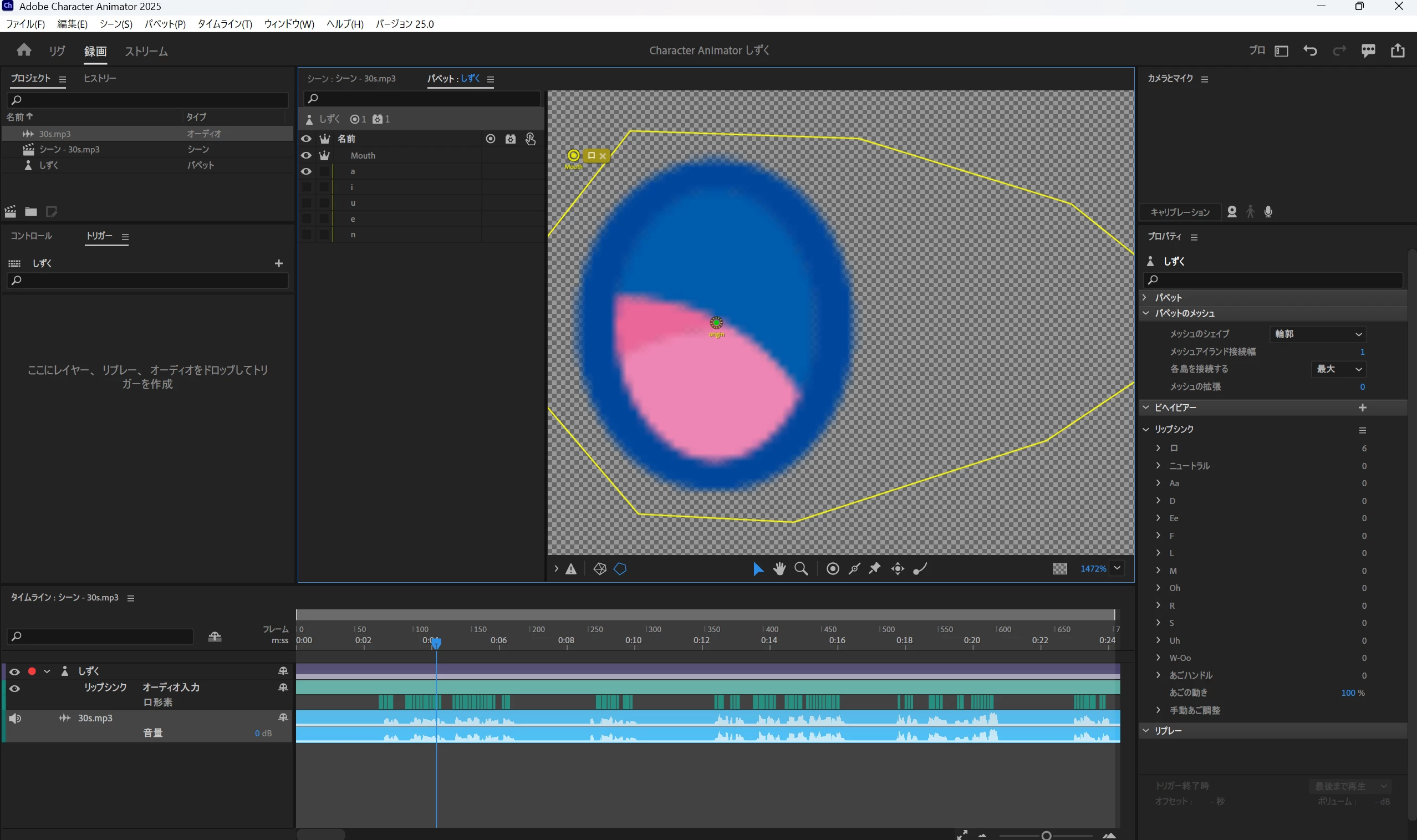 こんにちは。Adobe Character Animator 2025を使用しています。オーディオに合わせて口が動かない状態です。