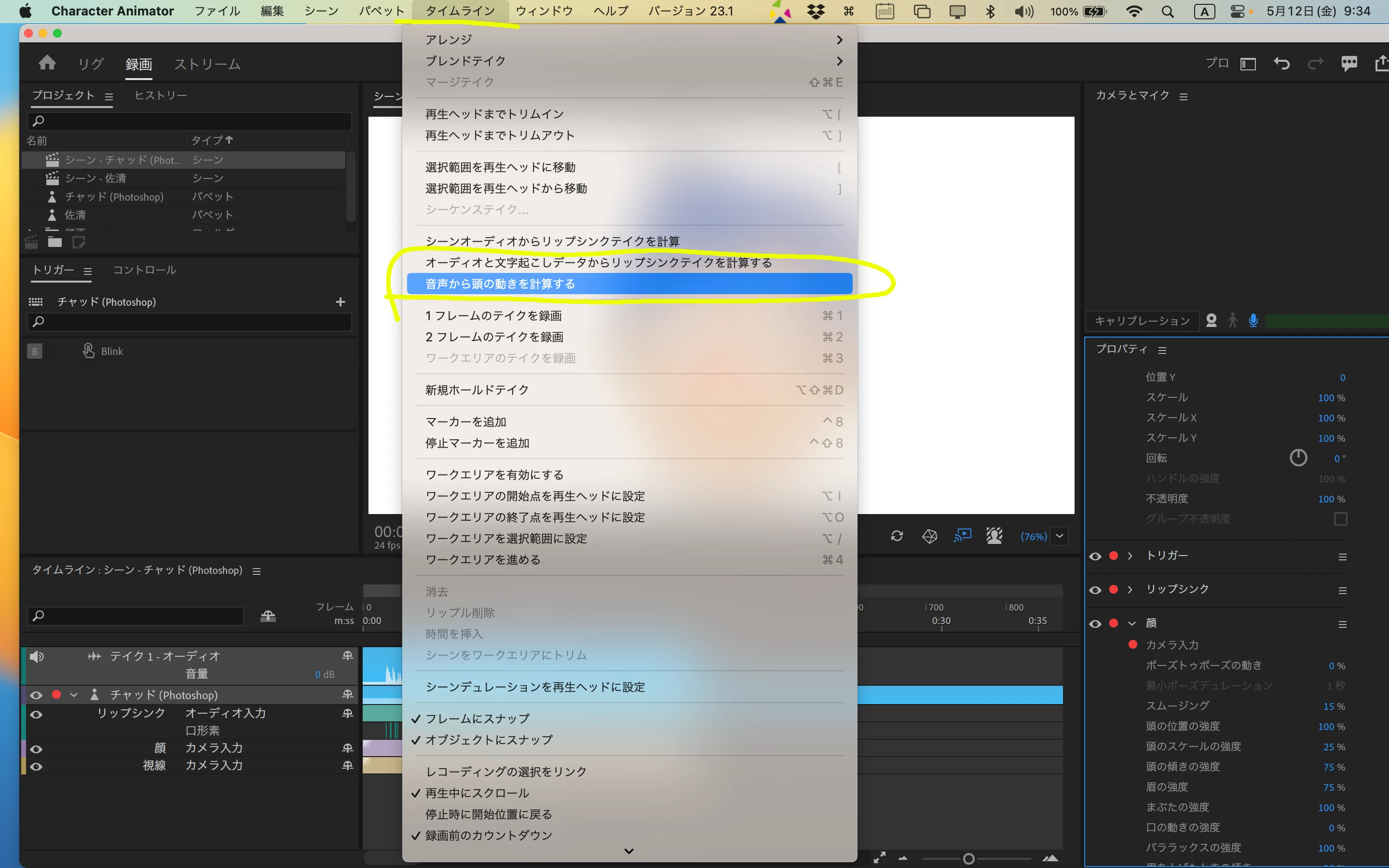 音声データが終わるまでずっと、頭だけ左右に少し揺らすアニメーションをつけたい(パペットは、首から上のみです。)