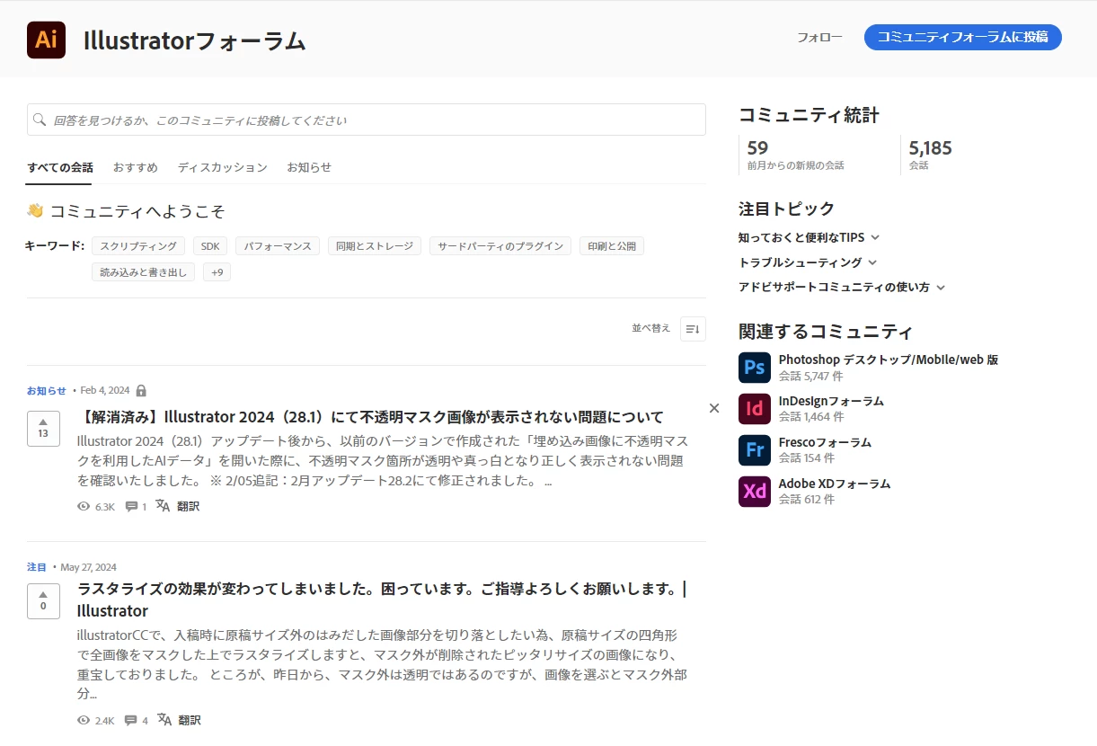 各フォーラムの中では、製品の使い方についての質問や、困ったユーザーからのSOSなど、色々なトピックが投稿されています。アドビ コミュニティ エキスパート(Adobe Community Expert)と呼ばれるプロユーザーや、経験豊富なユーザーのみなさんが有志で質問に答えてくれたり、問題を解決しようと一緒に悩んでくれたりします。 アドビスタッフから急ぎのお知らせも投稿されています。