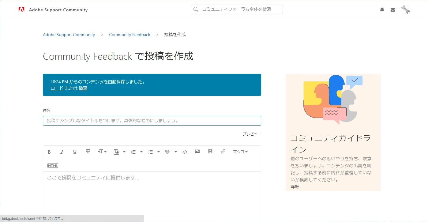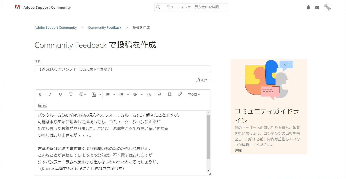 例えば、「投稿」や「返信」を1時間以上もかけて作成中、誤ってフォーラムのサイトを他のサイトで上書きした(同じタブのままで、他のサイトを見た)場合、苦労して書いた「投稿」や「返信」が台無しになってしまいます。