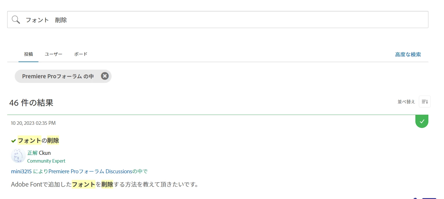 例えば、PremiereProのフォーラムで「フォントの削除」について調べようとしても、0件です。