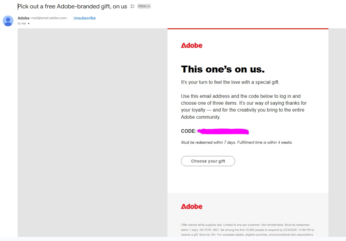 Hello, I just got an email from mail@email.adobe.com offering me a free adobe branded item. It looks legit to me with the headers but I'm scared to click on it. I think I'm hitting my 4 year anniversary on my billing cycle for CC so I wasn't sure if it's a real thing for that maybe?
