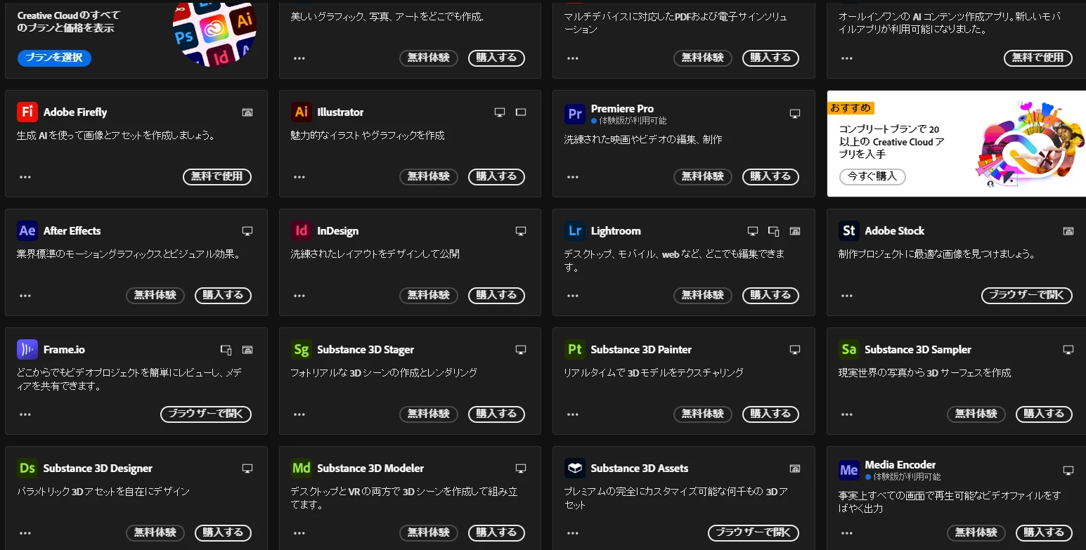 先日コンプリートプランに加入したのですが、クリエイティブクラウドのPhotoshopやIllustrator等のソフトのところにはインストールではなく、無料体験や購入するしか選択肢が無く、二重契約になりそうでいまだ手が出せません。