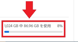 画面左下でストレージ全体の使用量を確認できるので、削除前よりも減ったか確認します。