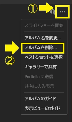 アルバムを選択し、画面右上にある三点リーダーをクリックし、さらに〔アルバムを削除〕をクリックします。