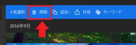 3. 削除したい写真にチェックを入れてから、画面上部の〔削除〕をクリックして削除します。
