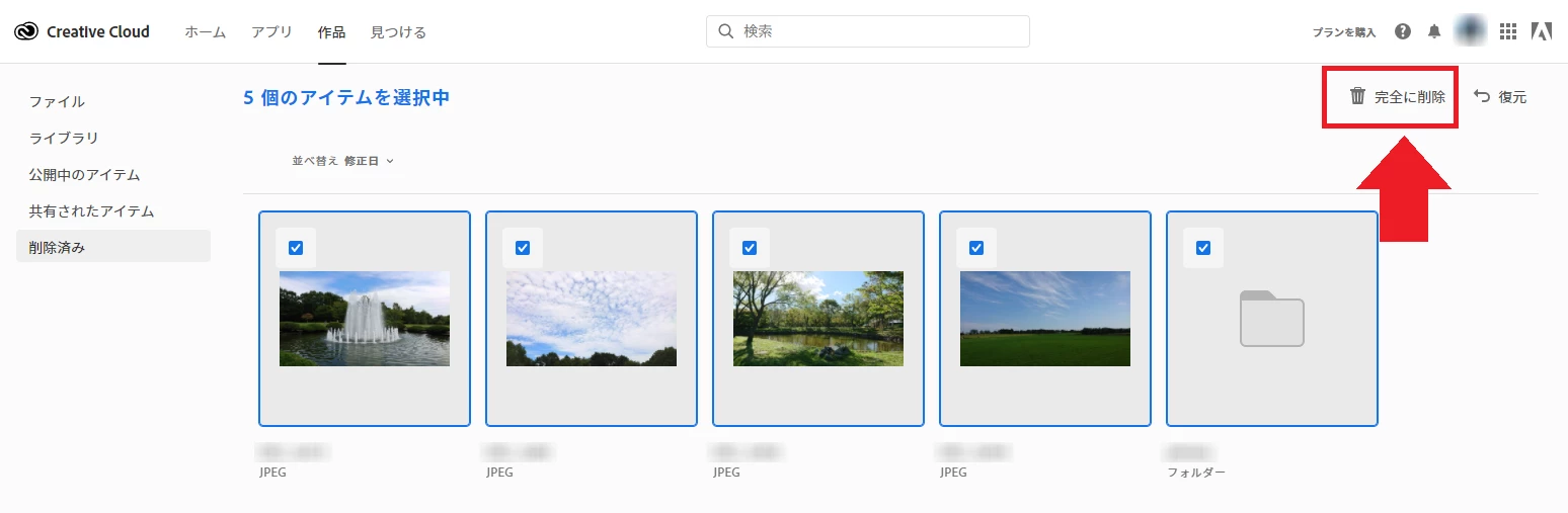 「削除済み」フォルダの中身が表示されたらすべてのファイルにチェックを入れ、画面右上の〔完全に削除〕をクリックします。