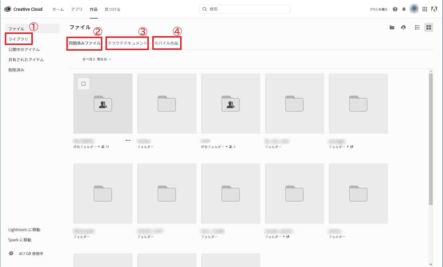 2. 「ライブラリ」「同期済みファイル」「クラウドドキュメント」「モバイル作品」について、不要なものがあれば削除します。