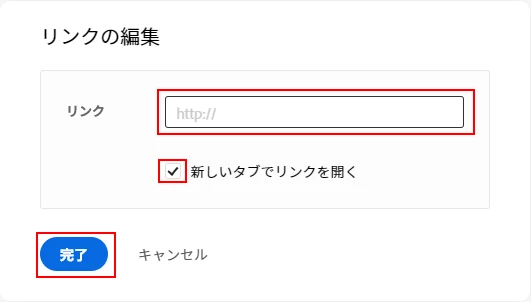 リンク先のURLを入力し、新規タブで開くかどうかのチェックを設定し、「完了」をクリックします。